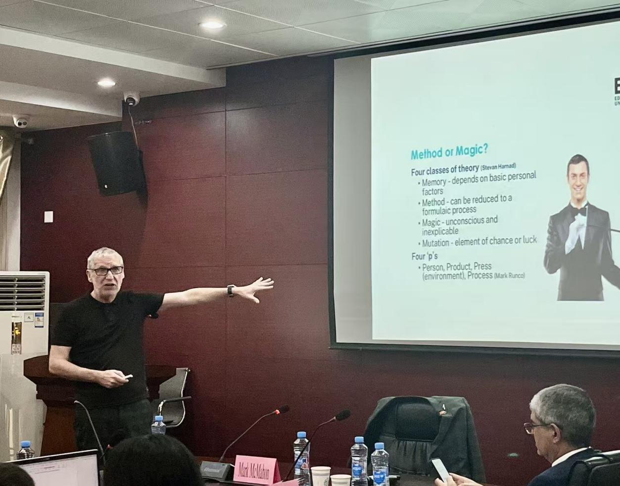 交流活动中,伊迪斯科文大学代表团核心成员、该校国际战略主任、艺术与太阳城娱乐 的MarkMcMahon教授带来主题分享“AI时代的创新”,深入剖析人工智能对创意产业与教育领域的影响。他指出,人工智能已从“未来概念”转变为“当下工具”,在创意领域中,AI并不会取代人类创造力,而是通过人机协同合作增强创意过程——例如借助前沿AI工具提升创意效率、拓展创意边界,同时强调人类所独有的同理心、直觉与想象力仍是不可替代的核心能力。这一观点与太阳城娱乐-澳门太阳城娱乐官网 “培养兼具人文素养与创新能力的人才”的目标高度契合,引发在场师生热烈讨论。
